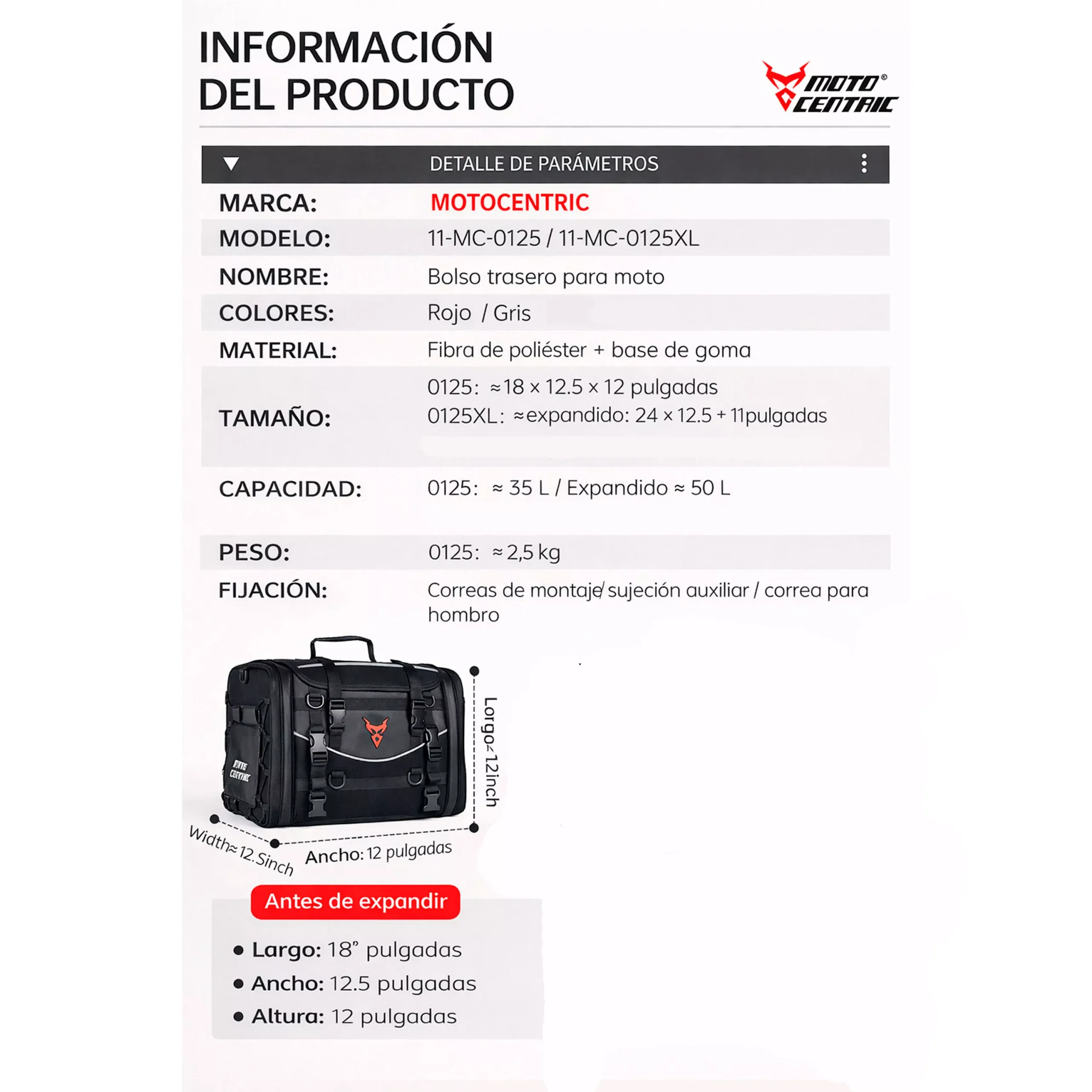 Su diseño rígido mantiene la forma incluso cargado, mientras que las correas ajustables permiten fijarlo firmemente al asiento o parrilla de la moto. Incluye correas adicionales y funda protectora para lluvia.
