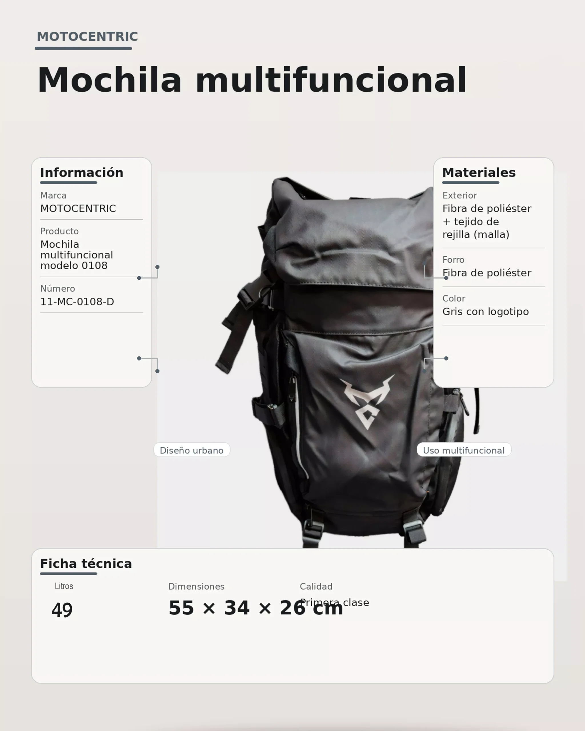 La mochila para moto Motocentric es una excelente opción para motociclistas que buscan gran capacidad, resistencia y comodidad en un solo producto. Con una capacidad aproximada de 48 litros, esta mochila multifuncional fue pensada para acompañarte en el uso diario, viajes en moto, trayectos urbanos y escapadas de fin de semana.