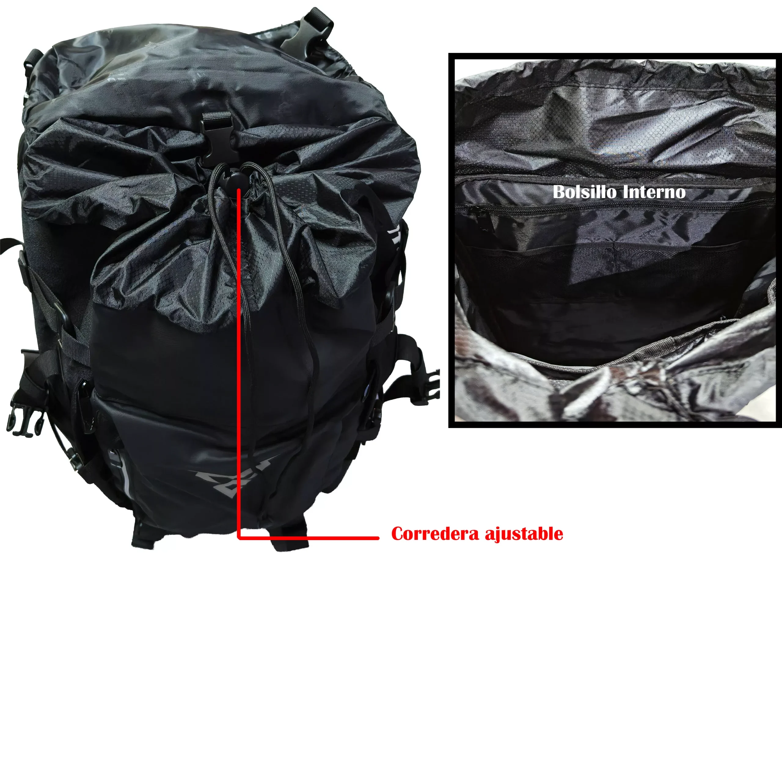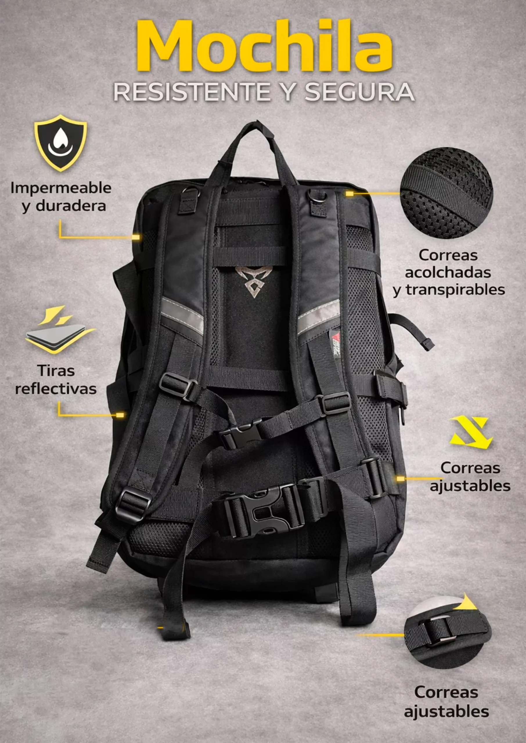 Fabricada con fibra de poliéster y tejido de rejilla, ofrece una estructura firme, durable y preparada para un uso intensivo. Su diseño incorpora correas ajustables, zonas acolchadas y transpirables, detalles reflectivos y amplio espacio interior, logrando una combinación ideal entre funcionalidad, confort y estética.
